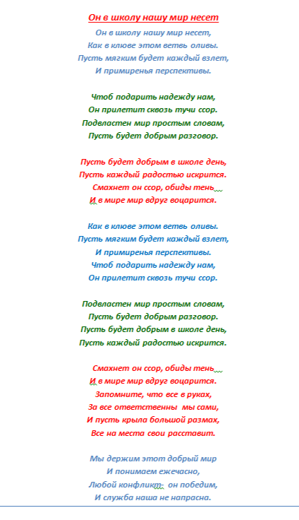 Немного из истории нашего символа. В 2019 году мы запустили конкурс среди ребят на выбор эмблемы школьной службы медиации. На конкурс поступило много работ, огромное количество из них были очень красивые, но нашей службе запомнился стих, который написала ученица 9 класса вместе с эмблемой голубя, которую мы представляем.
